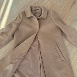 Brun kappa med en mörkare brun krage och detaljer i en ljusare grön färg. Kappan har en lös passform och knäpps med två knappar.