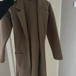 Brun kappa med huva och dragkedja framtill. Kappan har två fickor framtill och detaljerade sömmar. Varm och go.