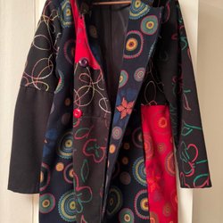 Kappan är kolsvart som ses bäst på bild 4. Sparsamt använd, mycket fin. Står 46 som storlek men är små - passar mig som har 44. Längd 90 cm, bröstvidd 55 cm. Blankt innerfoder. Fuskpälskrage. Obs- synliga sträck på kappan är från spegeln, dvs synvilla.