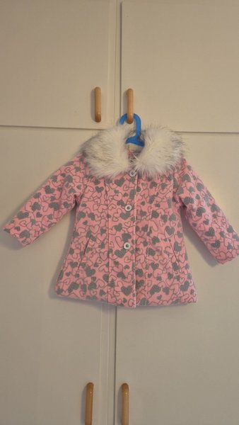 En rosa kappa med gråa hjärtan över hela plagget. Kappan har en vit fuskpäls krage och knappar framtill. Det finns två fickor på sidorna.