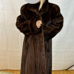 Brun ægte pelsfrakke med lange ærmer og en løs pasform. Frakken har en klassisk silhuet og er ideel til at holde varmen på kolde dage.