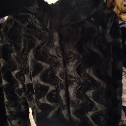 Svart pälsjacka!! med detaljer av päls vid krage och ärmslut. Jackan har två fickor fram och knäpps med knappar.