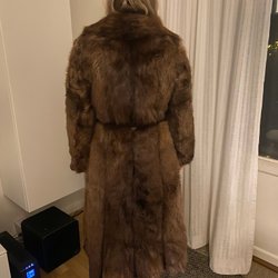 Brun fuskpäls kappa med krage och knäppning framtill. Perfekt för att hålla värmen under kyliga dagar.