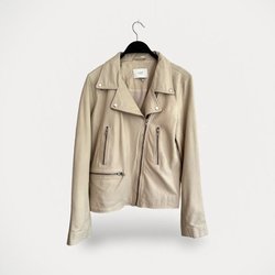 Dam jacka i 100% svinläder, köpt på MANGO, stl. M, beige färg, biker design. Långa ärmar med dragkedja, två sidofickor med dragkedja, V-ringning med slag, stängs framtill med dragkedja, innerfoder.