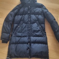 Svart dunjacka med dragkedja och tryckknappar fram. Jackan har en justerbar huva med dragsko och en hög krage. Det finns en logotyp på vänster ärm. Jackan har dragsko i midjan.