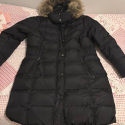 En mörkblå jacka med huva och dragkedja framtill. Väldigt lätt och värmt jacka för både hösten och vintern. Färgen är marinblå Längd 98 Bredd 57