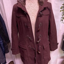 Rutig jacka med pälskrage, dubbelknäppning och bälte i midjan. Jackan har fickor fram.