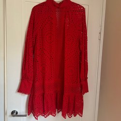 En röd klänning med ärmlös design. Klänningen har en enkel och stilren silhuett som passar bra för olika tillfällen.