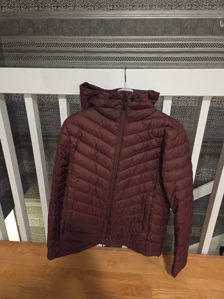 Vinröd Peak Performance jacka med huva. Jackan stängs med dragkedja.