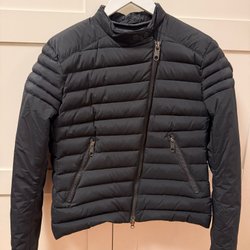Svart Peak Performance dunjacka med huva. Jackan har flera fickor med dragkedja och snölås.