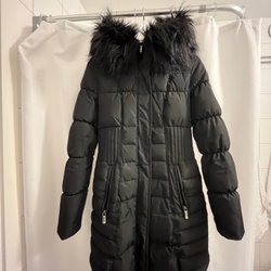 Längre fodrad vinterjacka med fakepäls runt luvan. Ett litet fäste har släppt i luvan, se sista bild.