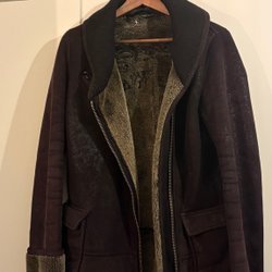 Brun jacka med fickor framtill och knäppning. Jackan har en krage och ett band i ryggen. Mocka.