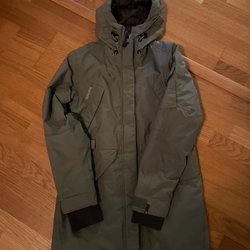 Grøn vinterjakke med hætte. Jakken har en lynlås og knapper foran, samt snøre i taljen. Foret er sort og quiltet.