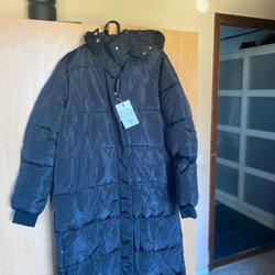 Svart, lång pufferjacka med huva. Jackan har en dragkedja framtill och två fickor. Vero Moda St S men funkar även som M