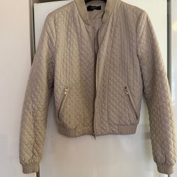 Beige jacka med dragkedja fram och muddar vid ärmslut och midja. Jackan har en krage.långa ärmar m bred mudd