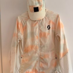 Grågrön vindjacka med huva och dragsko. Jackan har en dragkedja fram och dragsko nedtill.