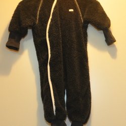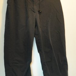 Gråa trikåbyxor med resår i midjan och dragsko. Byxorna har fickor framtill och dekorativa knappar vid bensluten. 3/4 långa ben.