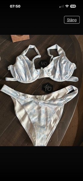 Ett set med en bikiniöverdel och underdel i ett ljusblått mönster. Båda delarna har etiketter. Storlek L i överdel