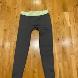 Grå träningsbyxor med hög midja och en liten logotyp på vänster ben. Endast använda en gång.