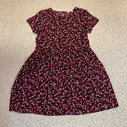 2. Svart kroppsnära klänning med blommigt mönster i grått, vitt och grönt. Klänningen har 3/4 ärmar och en rund halsringning samt två band över ryggen. Märke Vero Moda storlek Large men den är mindre och thigt.