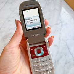 Nokia 2760 i röd och silver. Telefonen har en vikbar design. Den har en extern skärm som visar tid och aviseringar. Huvudskärmen är färg. Kameran är integrerad på framsidan av telefonen.