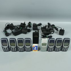 Nokia 3310 mobiltelefon. Telefonen är blå och har ett löstagbart batteri. Modellen är C168.