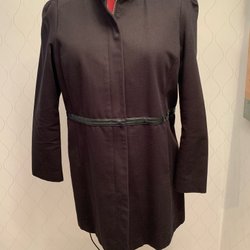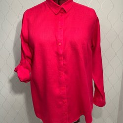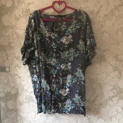 Prickig tunika med volang i tunt syntetiskt material ( kräver ett linne under). 3/4 ärm med resår i ärmslut. Knäppning fram samt lagda stråveck fram. Storlekslapp och märke är bort klippta men troligtvis Kappahl Xlnt, st XL.