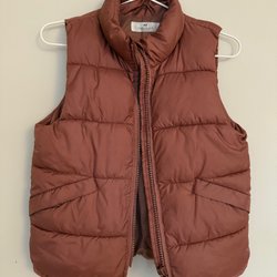 Mörkare i verkligheten. Svårt att få på bild. Rosa/röd vadderad väst med dragkedja fram och två fickor fram.