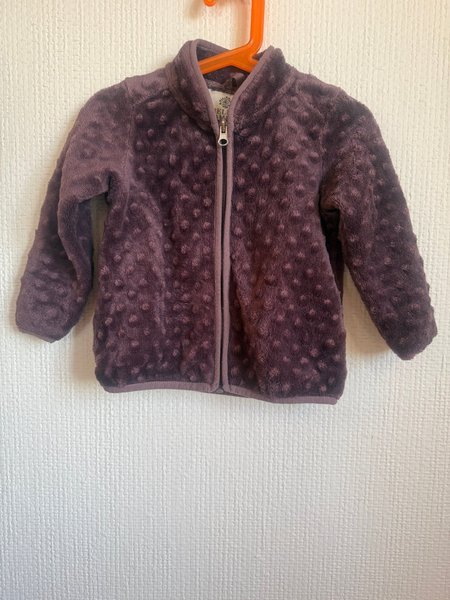 Lila fleecejacka med dragkedja framtill och ett mönster av små prickar.