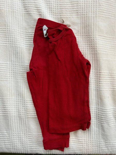 Ett set med en långärmad tröja och byxor i rött ribbat tyg. Från HM i strl 86.