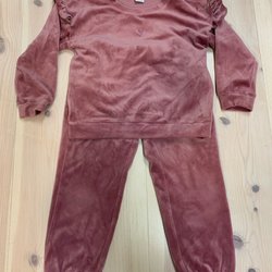 Ett sött set med Hello Kitty-tema, bestående av en kortärmad tröja och matchande shorts. Båda plaggen är i en rosa nyans och har Hello Kitty-motiv tryckt på framsidan av tröjan.