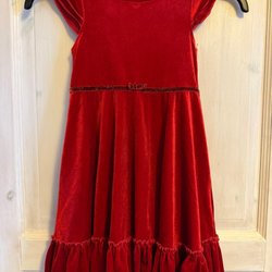 Fint set med en röd klänning och matchande leggings. Båda plaggen har ett juligt mönster med pepparkakshus, stjärnor, hjärtan och julgranar.