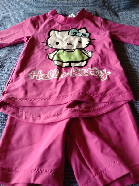 Ett sött set med Hello Kitty-tema, bestående av en kortärmad tröja och matchande shorts. Båda plaggen är i en rosa nyans och har Hello Kitty-motiv tryckt på framsidan av tröjan.