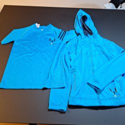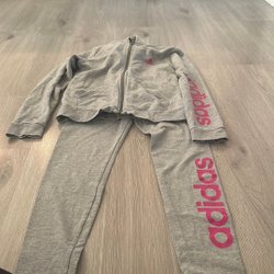 Ett rött träningsset med en jacka med dragkedja och matchande byxor. Både jackan och byxorna har dekorativa märken.