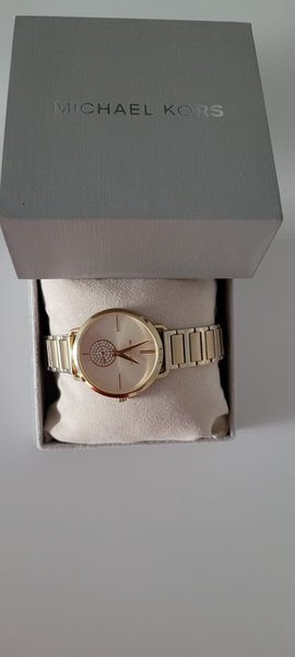 Michael Kors damklocka i guldtonad metall. Klockan har runt ur med ljus urtavla och dekorativ detalj i mitten. Länkarmband i matchande guldtonad metall med viklås. Modell avsedd för kvinna.