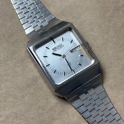 Vintage Seiko Actus automatisch herenhorloge. Het horloge heeft een zilverkleurige wijzerplaat met een dag- en datumaanduiding. De kast en band zijn van roestvrij staal. Het horloge is in goede staat.