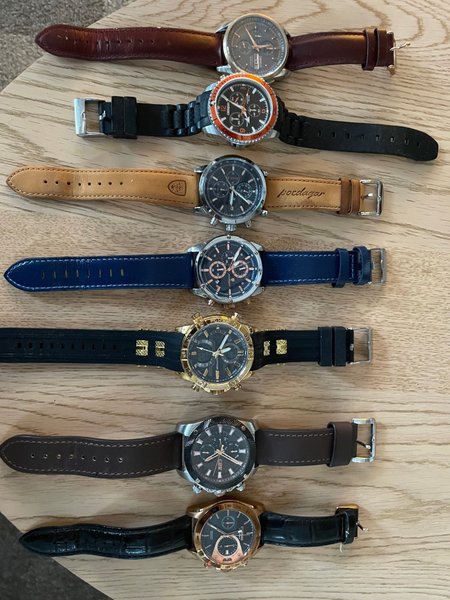 Parti med 7 armbandsur i varierande utföranden. Klockorna har olika armband i läder och andra material. Vissa av klockorna har detaljer i guld och orange. Batterier är dags byta på dom annars hela.
