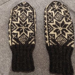 Ett par handstickade vantar i ett vackert mönster med ränder i lila, vitt, grått och beige.