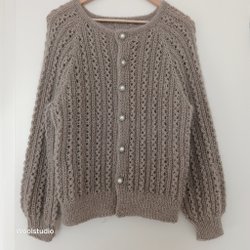 Ett par stickade vantar med flätmönster. Vantarna är handgjorda och har en tumkil.