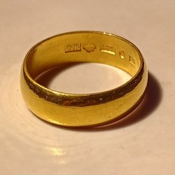 Ringen har en djupstämpel 21.. detta kan vara OBS! Ringstorlek ej med någon säkerhet är det karatstämpel då det ej står k bakom ..anledning att man kan klargöra att ringen är guld ( ej vilken karat ) är att ringen EJ är magnetisk vilket tyder på guld ,, jag har EJ lämnat in den för att göra syratest ,, jag vill inte ha det kvar om någon kan göra en vinstlott så gratulerar jag ... Hoppas detta är nog tydlig förklaring /Eva