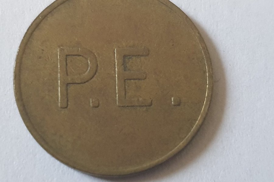 Metall token med inskriptionen P.E.