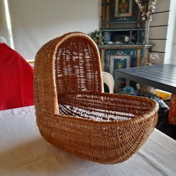 En fin korgvagga med tillhörande rottingställning på hjul.