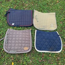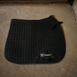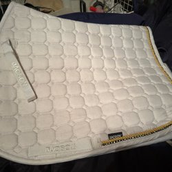 Ett vitt schabrak med quiltat mönster och grå kant. Använd endast vid en tävling och tvättad. Storlek Pony.