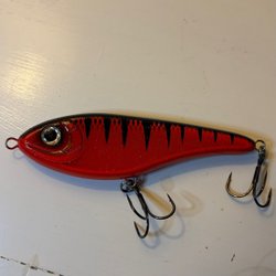 Baitcasting rulle med en röd spole och ergonomiska handtag. Kan behövas servas.