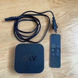 Apple TV med fjärrkontroll. Vet ej vilken modell det är. Inga sladdar följer med, men den fungerade sist jag testade den.
