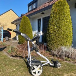 Golfvagn med tre hjul. Vagnen har en hållare för dryck och en för scorekort. Den är hopfällbar för enkel förvaring och transport. Har även hållare för paraply i regniga Sverige