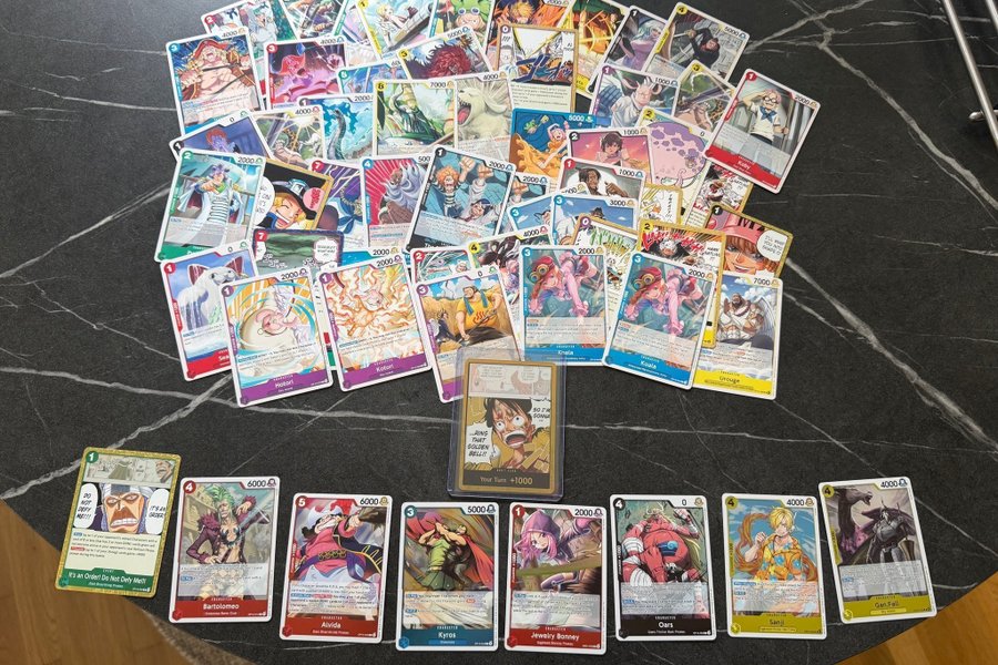 En liten samling på mellan 50-60 one piece kort, alla är från ”Adventure on Kami’s island”. Mest common kort men några foils med som syns längst ner på bilden. Korten är i mycket bra skick. Togs ut från pärm för fotografering.