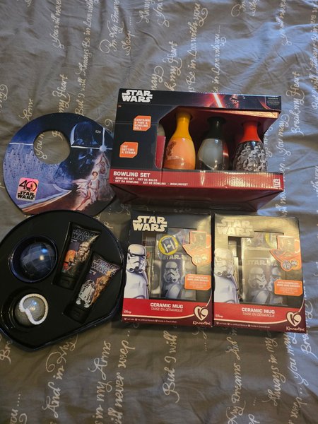 Star Wars bowling set, muggar med choklad och märken, duschgel set och en Star Wars skiva.
