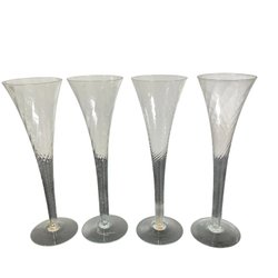 Set med 4 champagneglas. Glasen har ett mönster av korsande linjer.höjd c:a 15,8 cm, diameter c:a 6,3 cm. Rymmer 10 cl om man fyller upp till överkant av mönster.