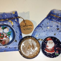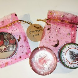 Doftljus av sojavax i en värmetålig metallburk med lock. Både burk och lock har ett fint jultema. Det är tillsatt naturlig eterisk olja för doft och särskild färg avsedd för ljustillverkning. Ljuset är dekorerat med torkade blommor och glitter. Detta ljus har doften av FIKON / FIG. Handgjort och 100% unikt.